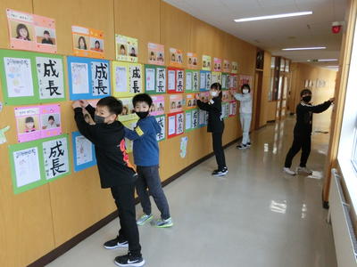 今日は4時間授業にして、午後、5年生と先生方とで卒業式の会場設営と校内の飾り付け作業をしました。