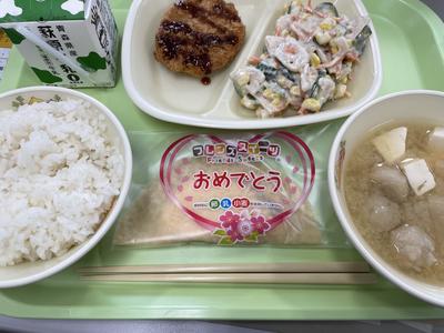 本日の給食は「卒業おめでとう」いちごクレープがつきました。